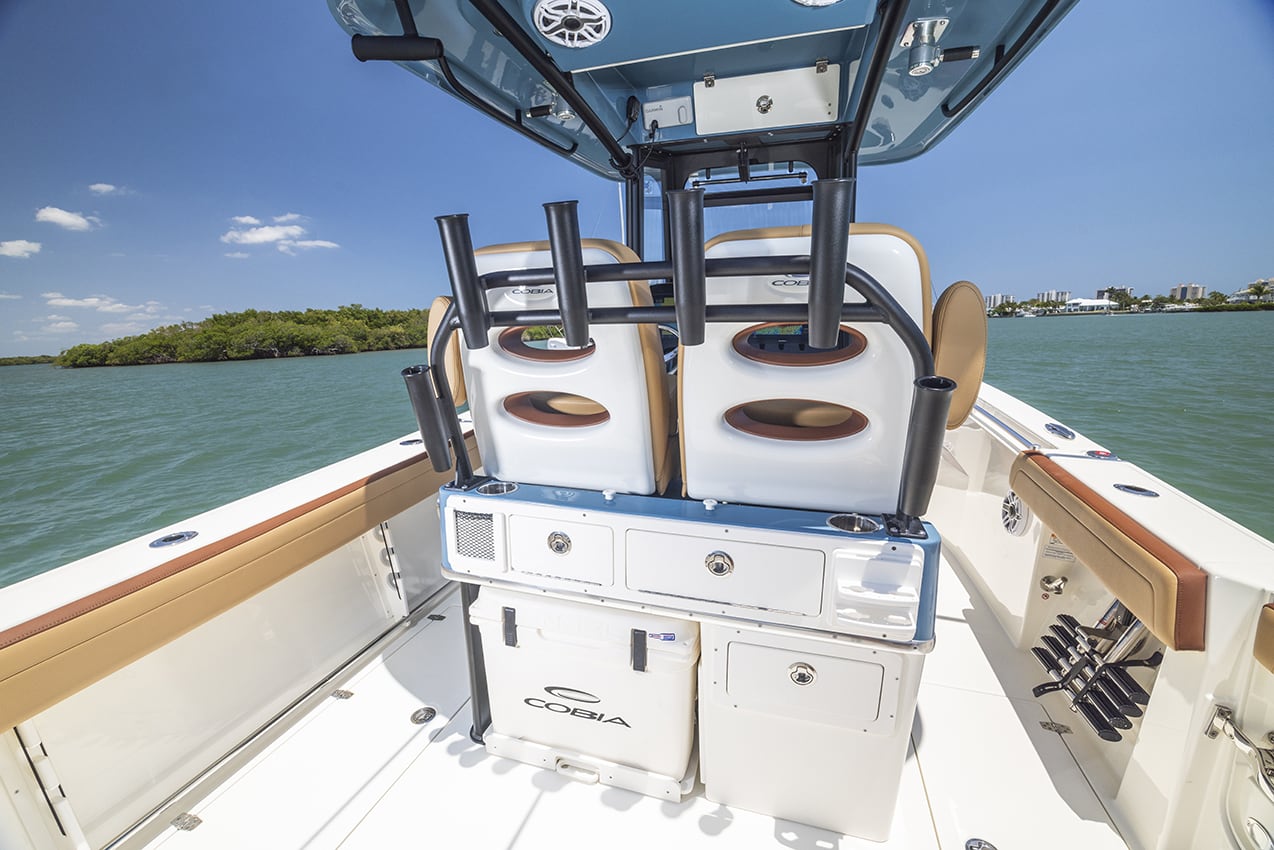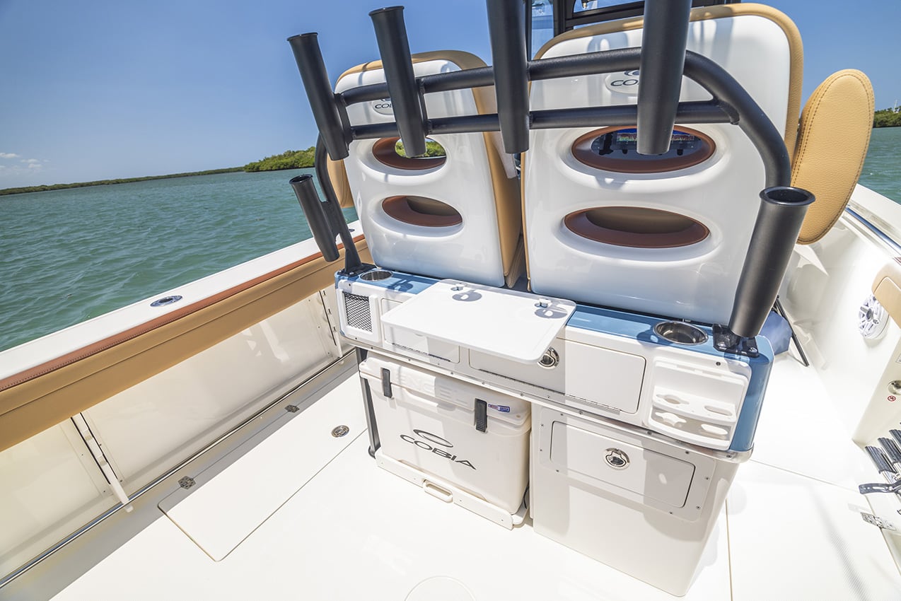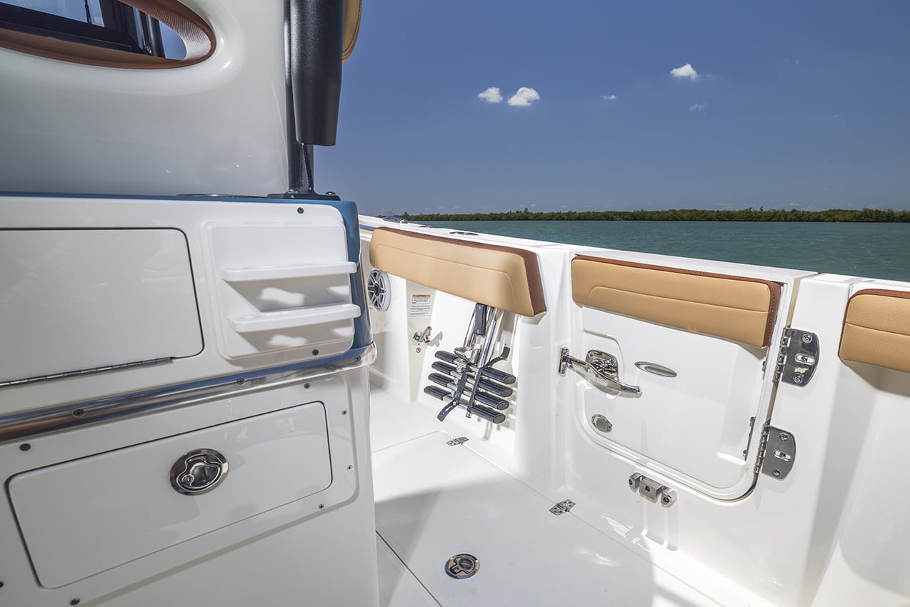Spacious helm seating on the 265 CC Open comes standard with a premium tackle station with cooler and slide or choose from additional options, add a leaning post rod holder and include the Seakeeper 1 for an even more enjoyable day on the water.