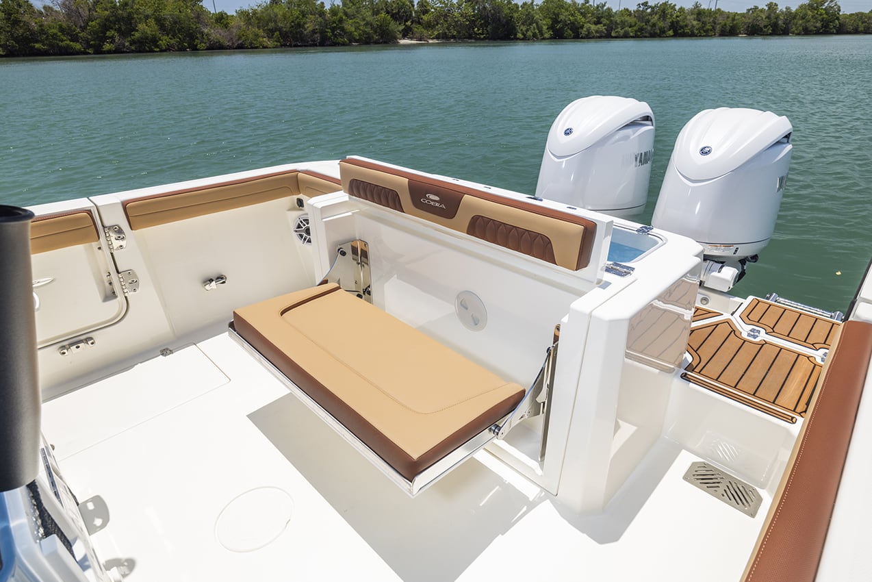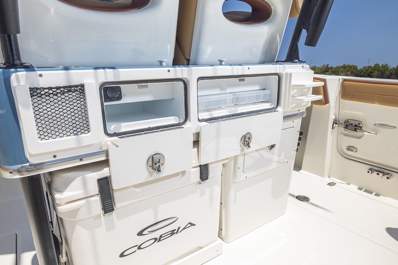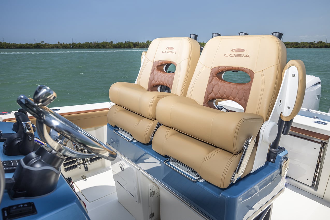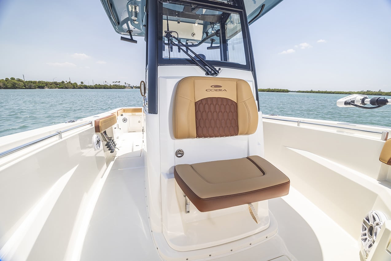 Spacious helm seating on the 265 CC Open comes standard with a premium tackle station with cooler and slide or choose from additional options, add a leaning post rod holder and include the Seakeeper 1 for an even more enjoyable day on the water.