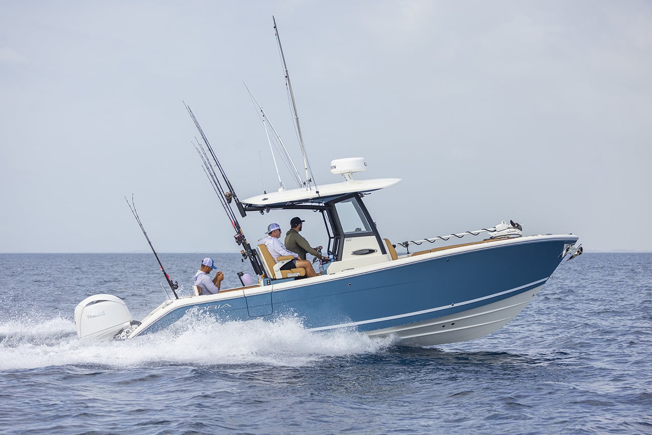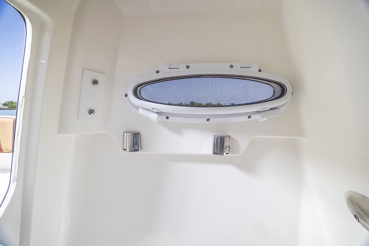 The 265 CC Open takes angling a step further. It builds on the features and innovation of the 265 CC, the inward-opening side entry door; user-friendly helm; available integrated hardtop frame with tempered glass enclosure, wiper and vent; plus, the updated Garmin electronics package offering that can accommodate dual 16″ screens.