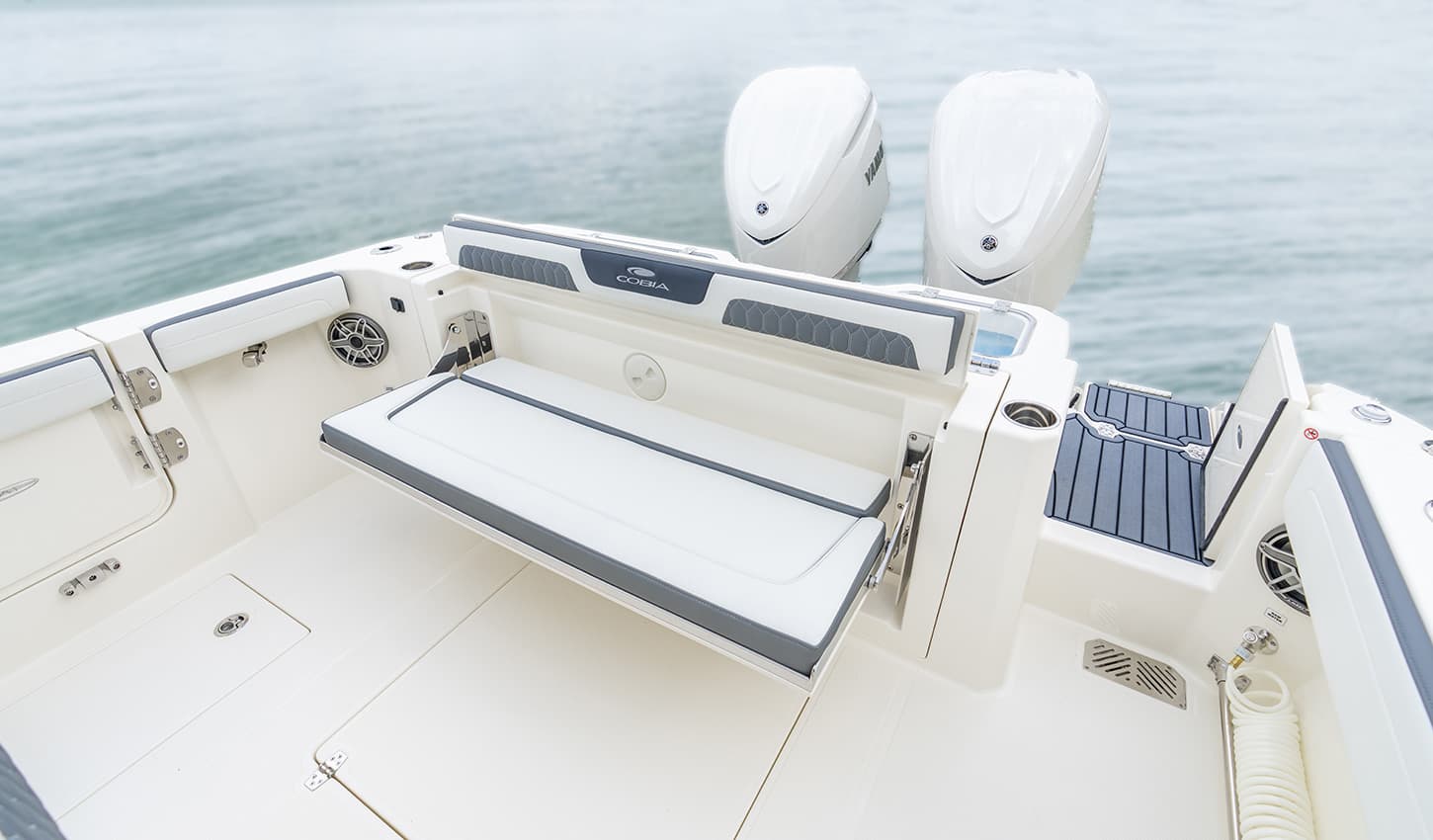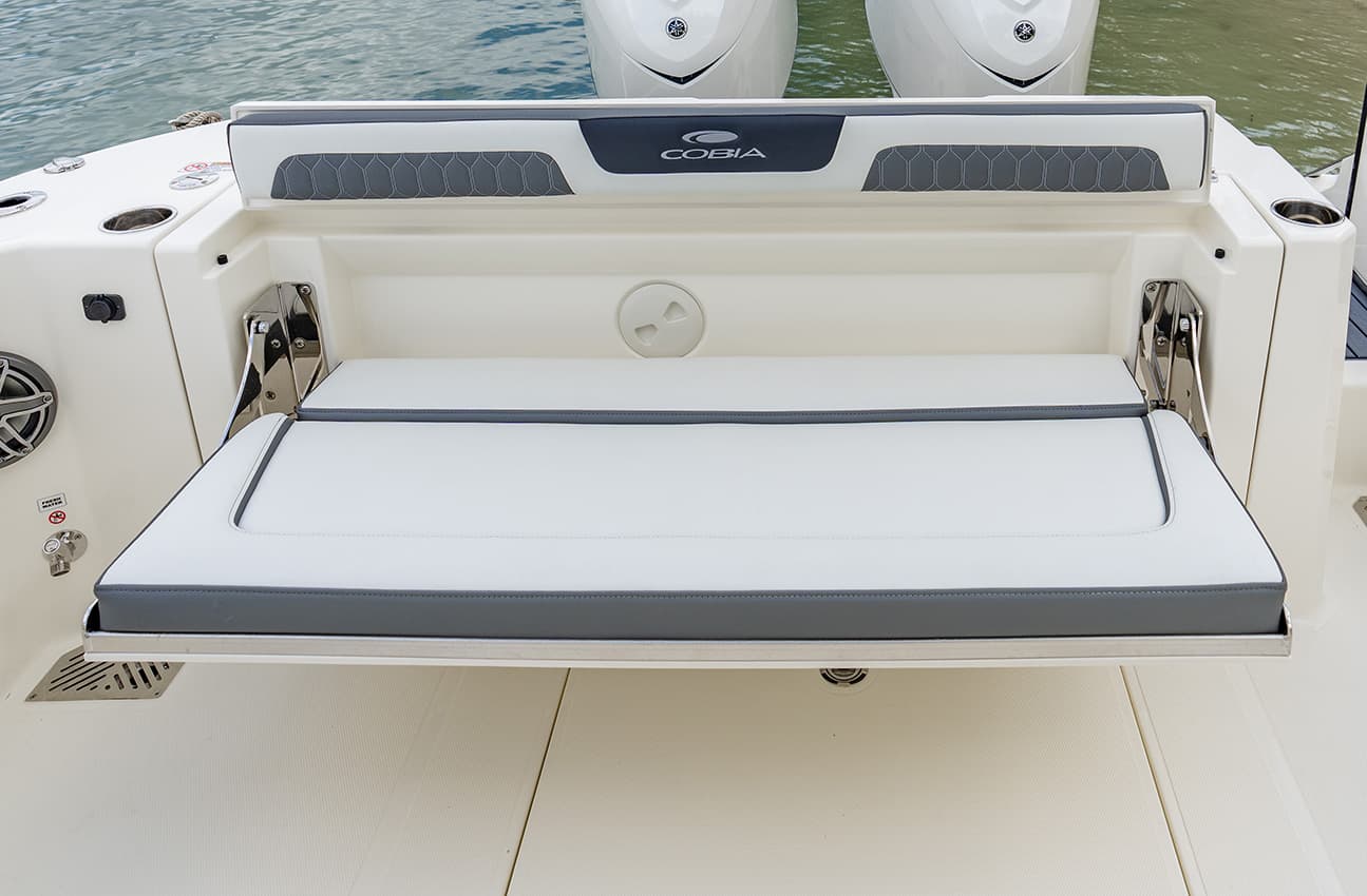 Spacious aft seating for three ensures a smooth, safe ride when underway, folding up for extra fish-landing floor space when you’re in angler mode.