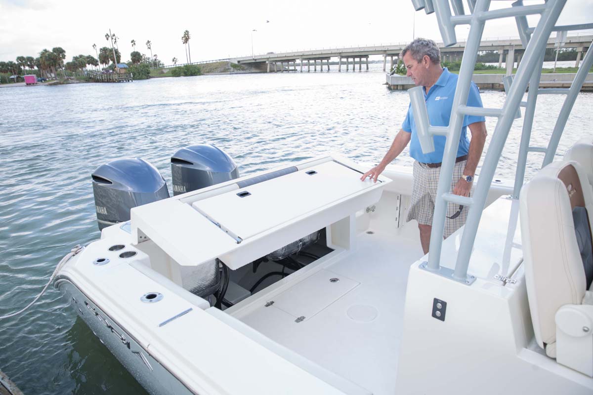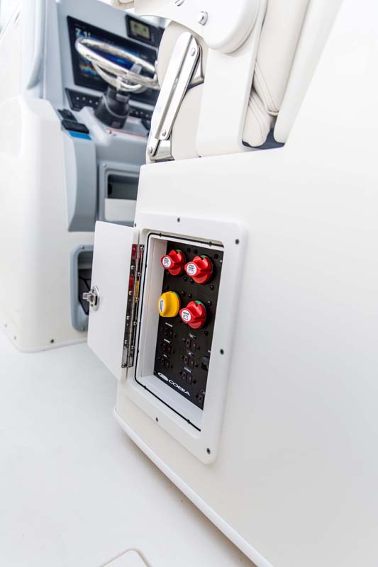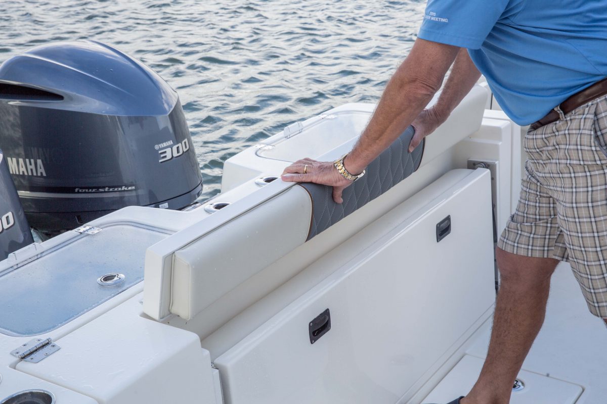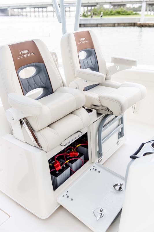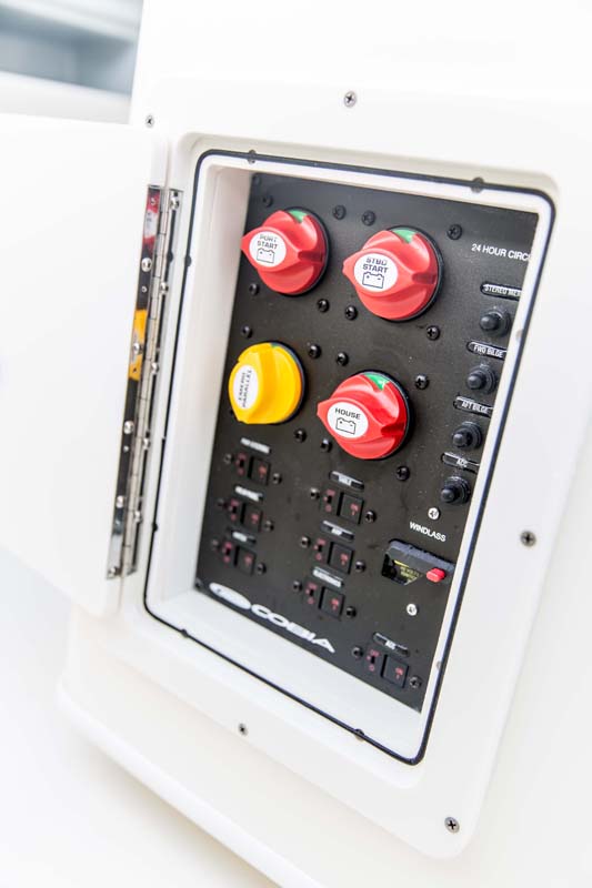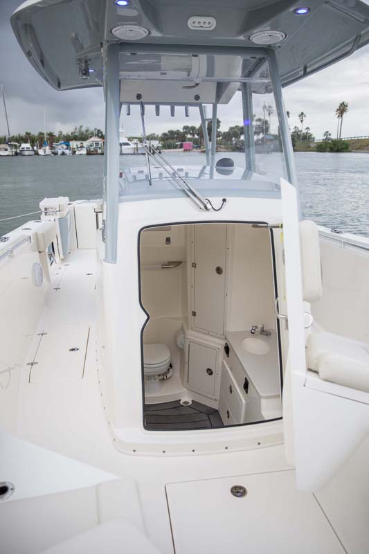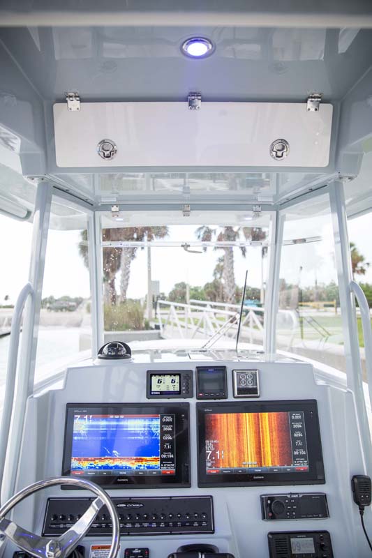 But the 320 CC is much more than a hardcore fishing machine. With elegant front seating, an electric bow table, inward-opening side door, optional integrated windshield, and a spacious walk-down forward entry head with 6’2″ of headroom, this boat puts a premium on riding in style. Combine all of this with the 320 CC hull’s top-of-class ride and it is sure to be a stunner whether on the trolling grounds or at the marina.