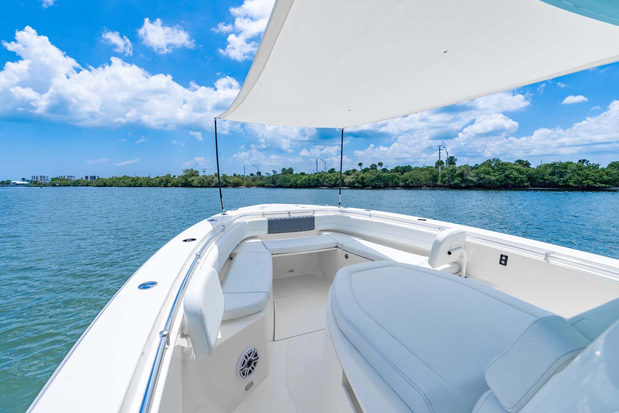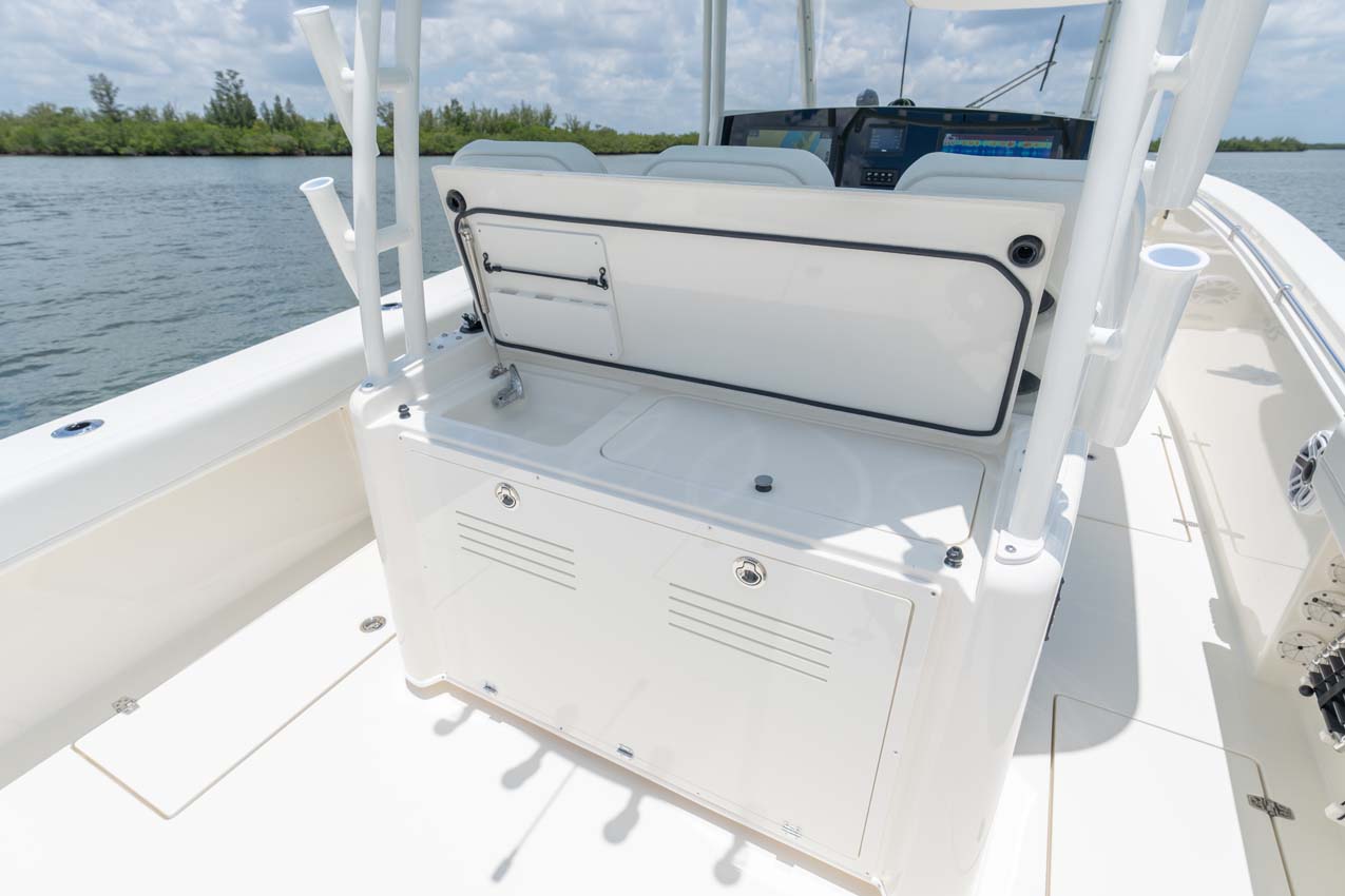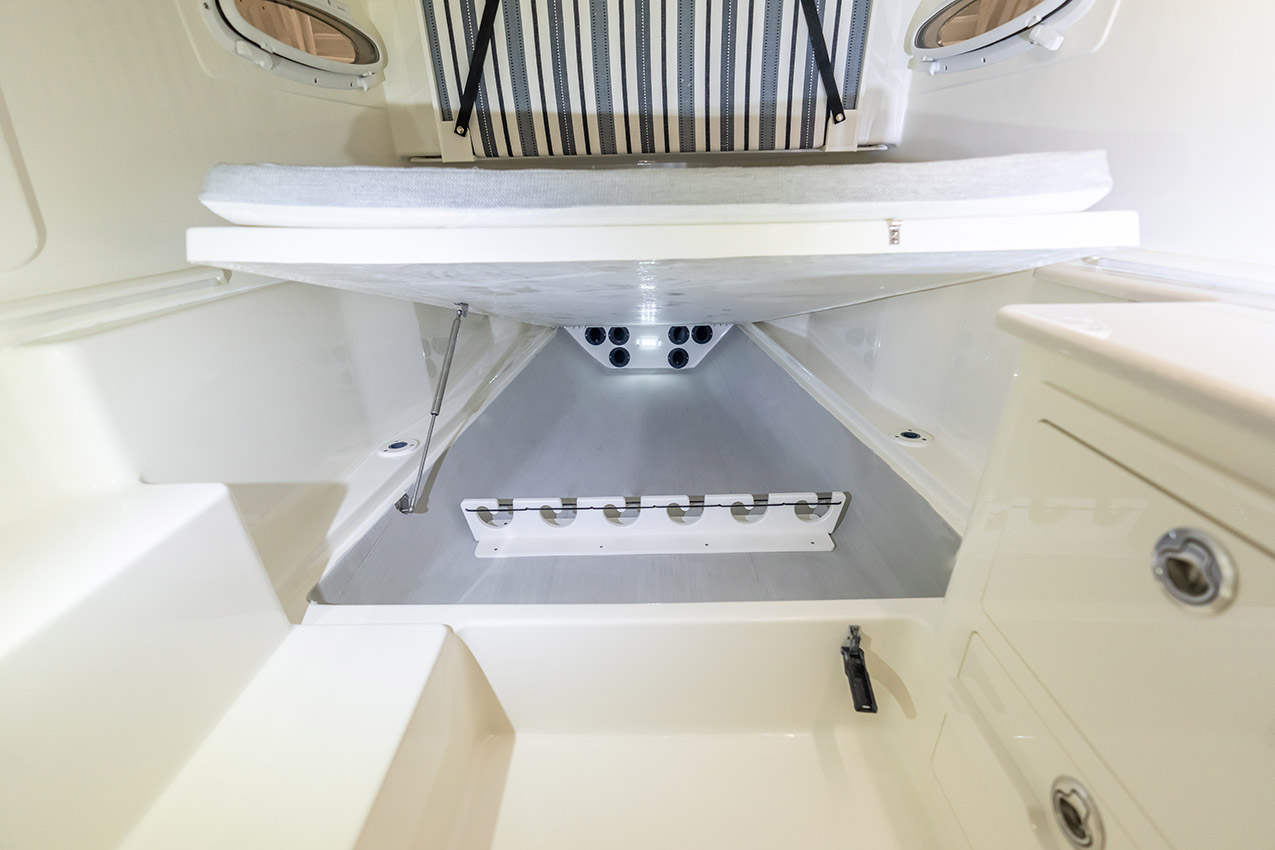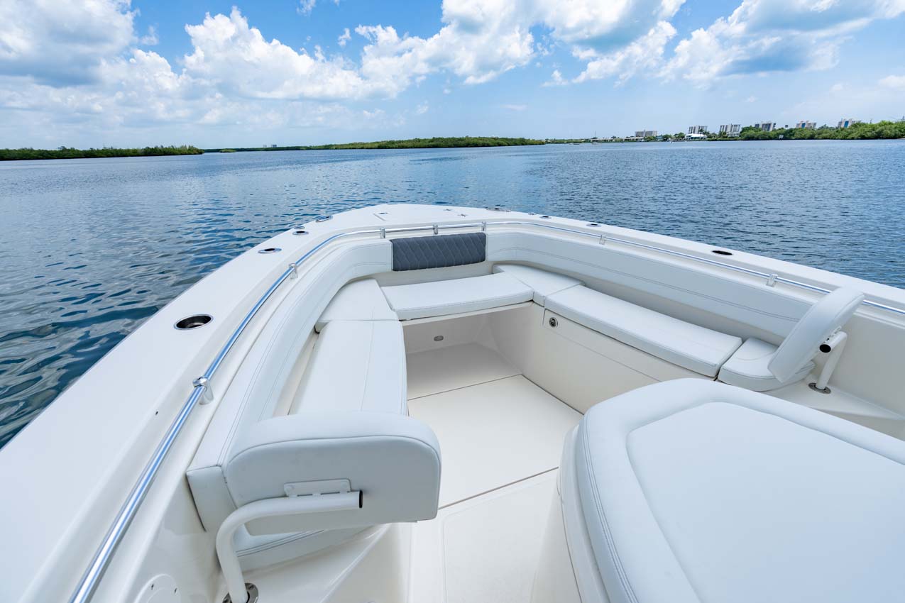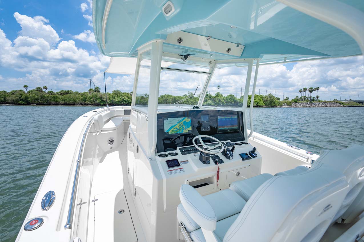 Tournament-capable fishing features include dual 42-gallon bait tanks, two huge in-floor fishboxes that pump overboard, a full tackle station and bait prep area, plus a hidden below-deck rod locker that’s lockable. With a wide-open cockpit, there’s plenty of room for a group of anglers and when it’s time to relax, it converts to a cruising and sandbar-hopping vessel with well-appointed seating for 11. That means triple independent helm seats, an integrated chaise lounge big enough for two and full sun lounge capability with forward-facing backrests. Plus, the inside of the console houses a spacious, airy berth that’s surrounded by a refined interior with wooden cabinetry, an electric head and a combination sink/shower.