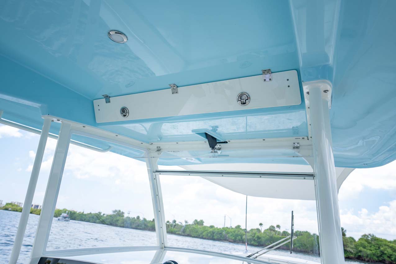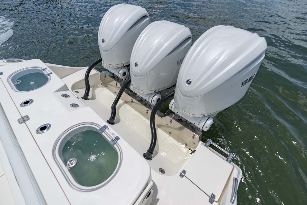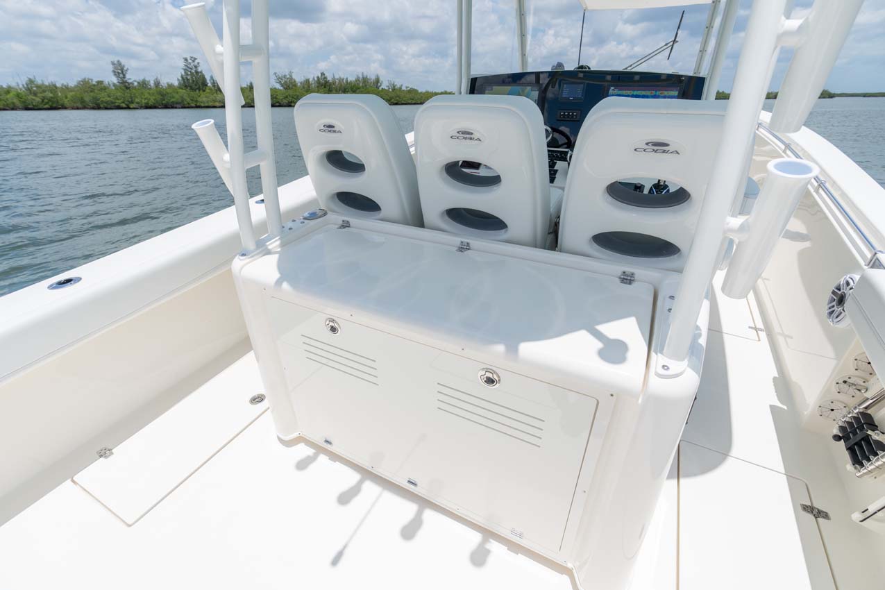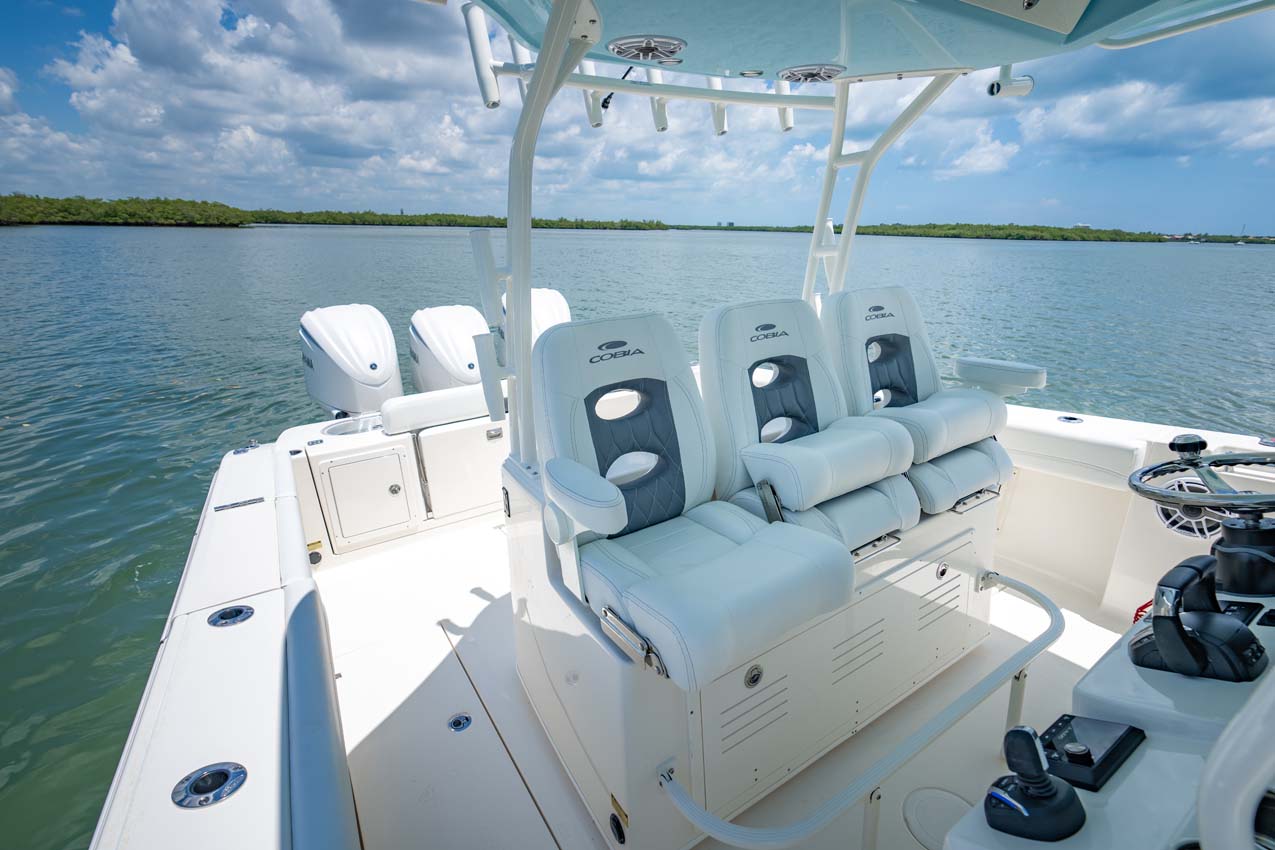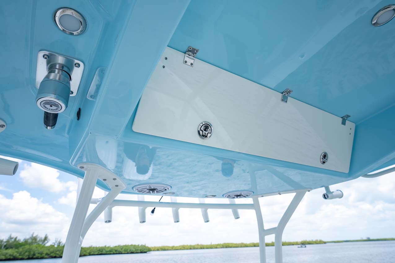 Tournament-capable fishing features include dual 42-gallon bait tanks, two huge in-floor fishboxes that pump overboard, a full tackle station and bait prep area, plus a hidden below-deck rod locker that’s lockable. With a wide-open cockpit, there’s plenty of room for a group of anglers and when it’s time to relax, it converts to a cruising and sandbar-hopping vessel with well-appointed seating for 11. That means triple independent helm seats, an integrated chaise lounge big enough for two and full sun lounge capability with forward-facing backrests. Plus, the inside of the console houses a spacious, airy berth that’s surrounded by a refined interior with wooden cabinetry, an electric head and a combination sink/shower.