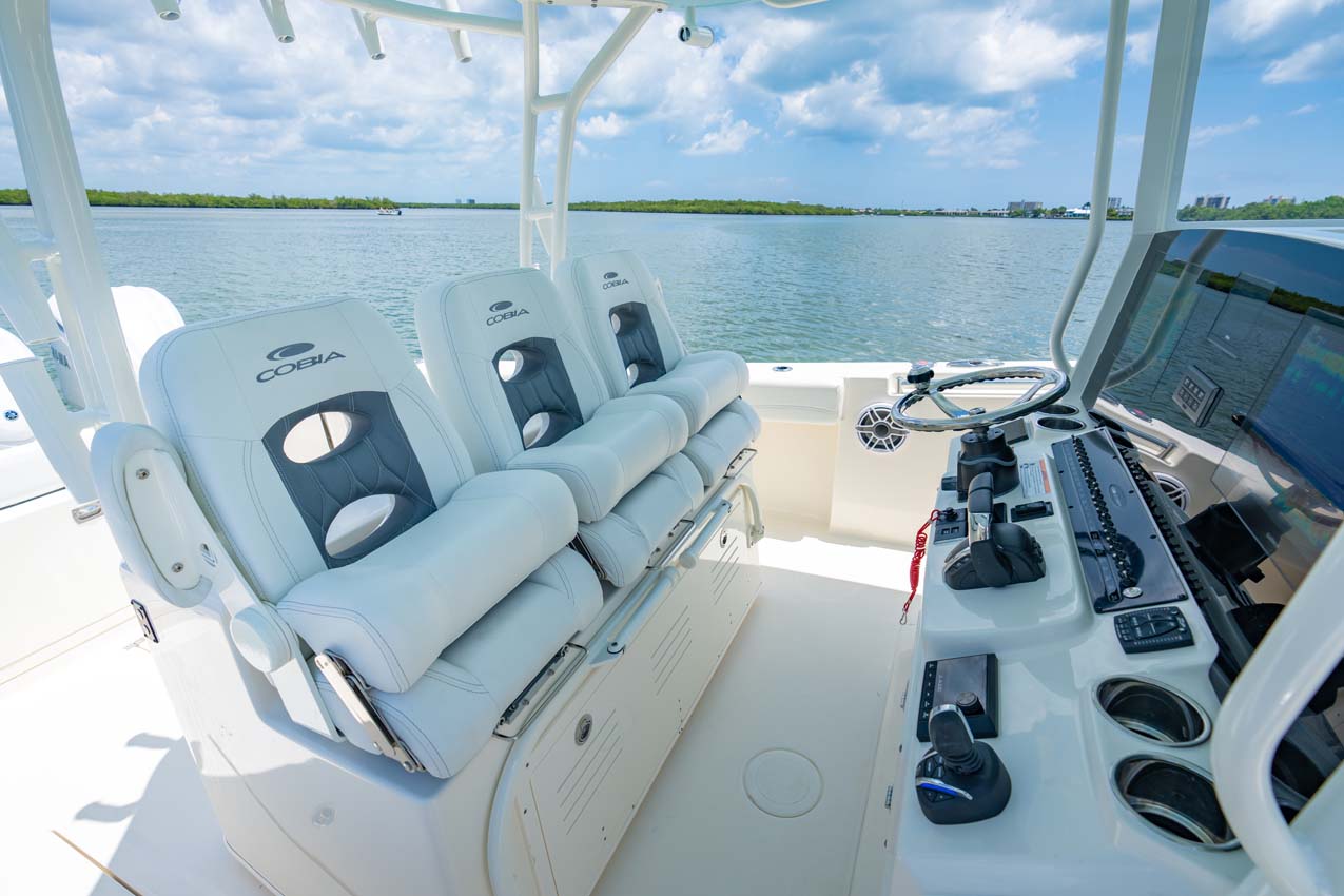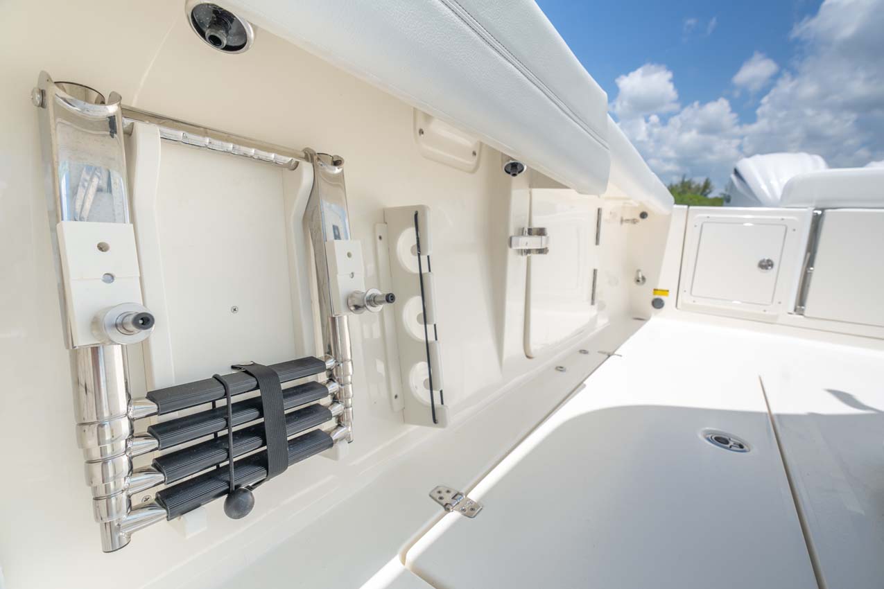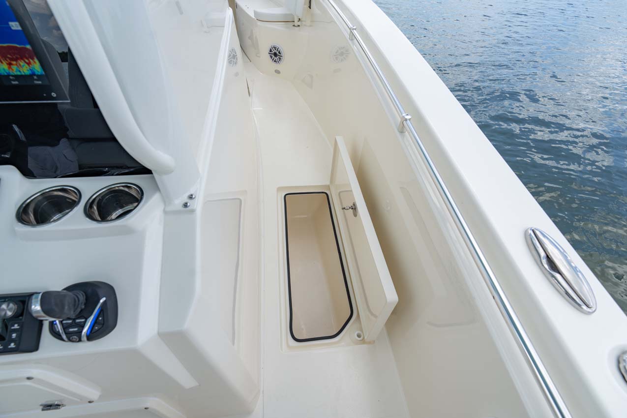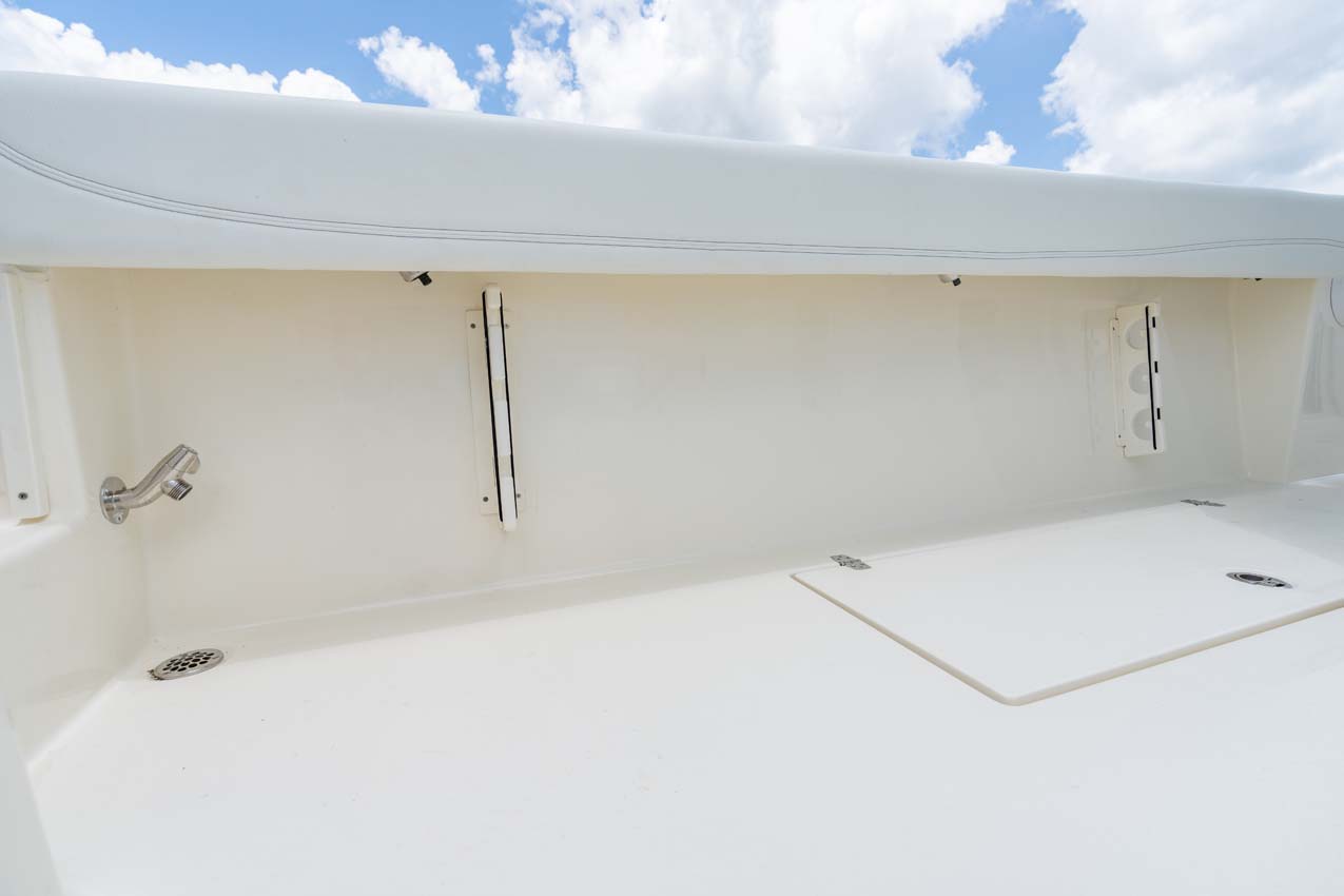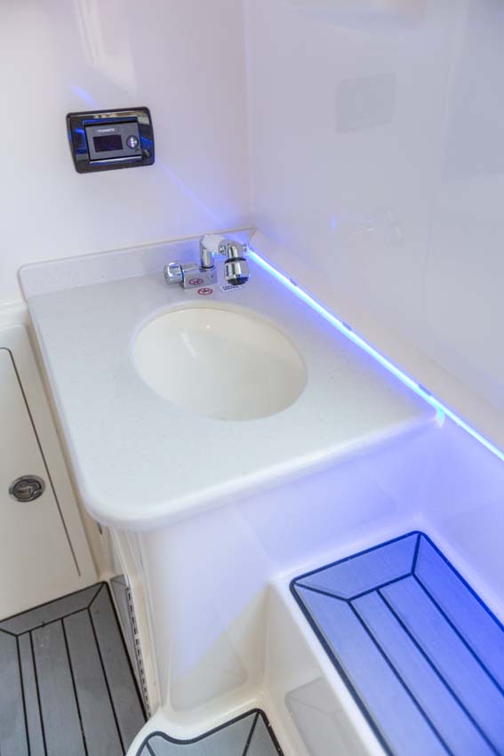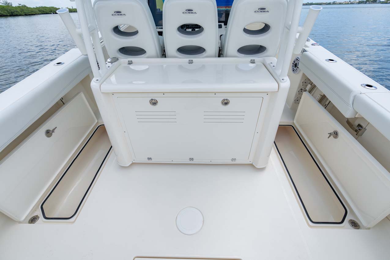 Tournament-capable fishing features include dual 42-gallon bait tanks, two huge in-floor fishboxes that pump overboard, a full tackle station and bait prep area, plus a hidden below-deck rod locker that’s lockable. With a wide-open cockpit, there’s plenty of room for a group of anglers and when it’s time to relax, it converts to a cruising and sandbar-hopping vessel with well-appointed seating for 11. That means triple independent helm seats, an integrated chaise lounge big enough for two and full sun lounge capability with forward-facing backrests. Plus, the inside of the console houses a spacious, airy berth that’s surrounded by a refined interior with wooden cabinetry, an electric head and a combination sink/shower.