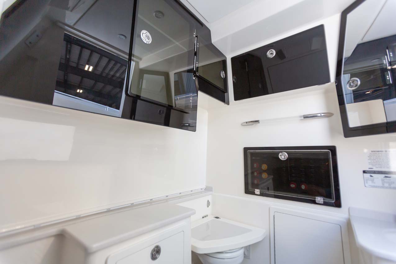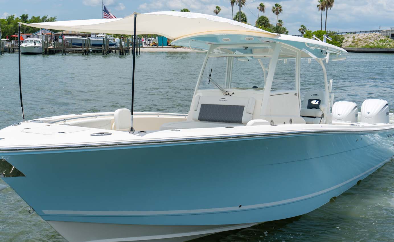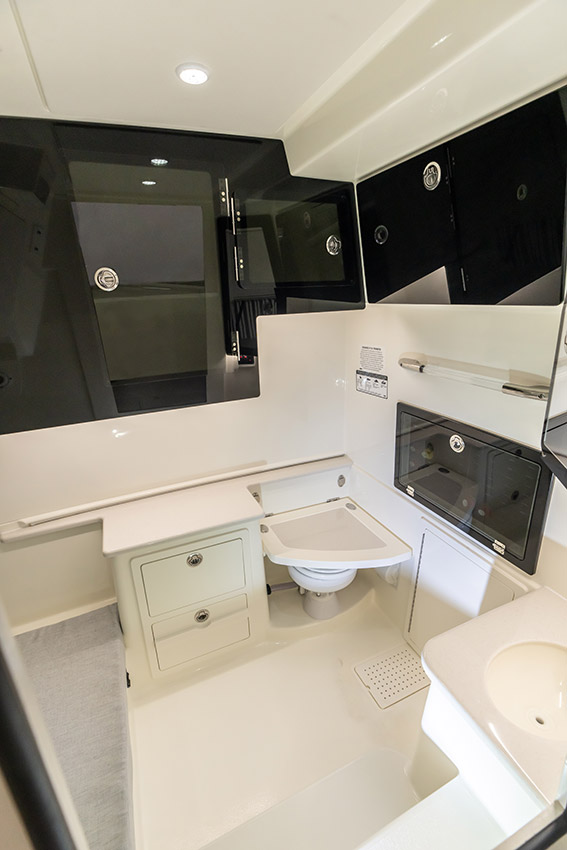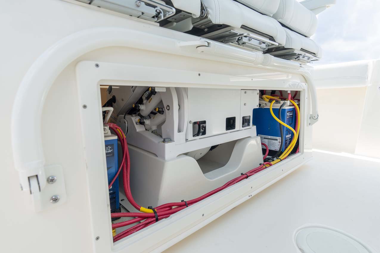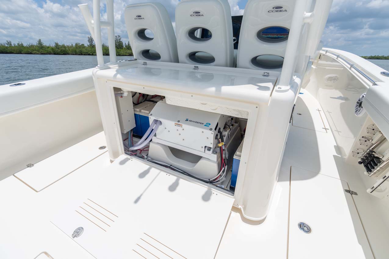Tournament-capable fishing features include dual 42-gallon bait tanks, two huge in-floor fishboxes that pump overboard, a full tackle station and bait prep area, plus a hidden below-deck rod locker that’s lockable. With a wide-open cockpit, there’s plenty of room for a group of anglers and when it’s time to relax, it converts to a cruising and sandbar-hopping vessel with well-appointed seating for 11. That means triple independent helm seats, an integrated chaise lounge big enough for two and full sun lounge capability with forward-facing backrests. Plus, the inside of the console houses a spacious, airy berth that’s surrounded by a refined interior with wooden cabinetry, an electric head and a combination sink/shower.