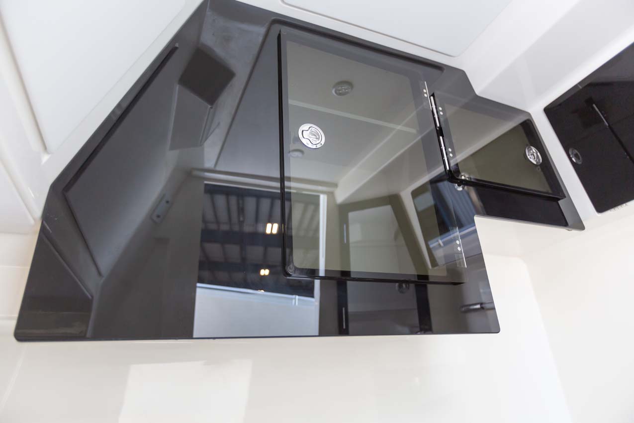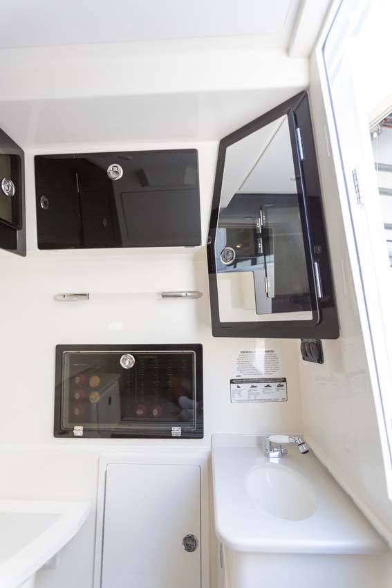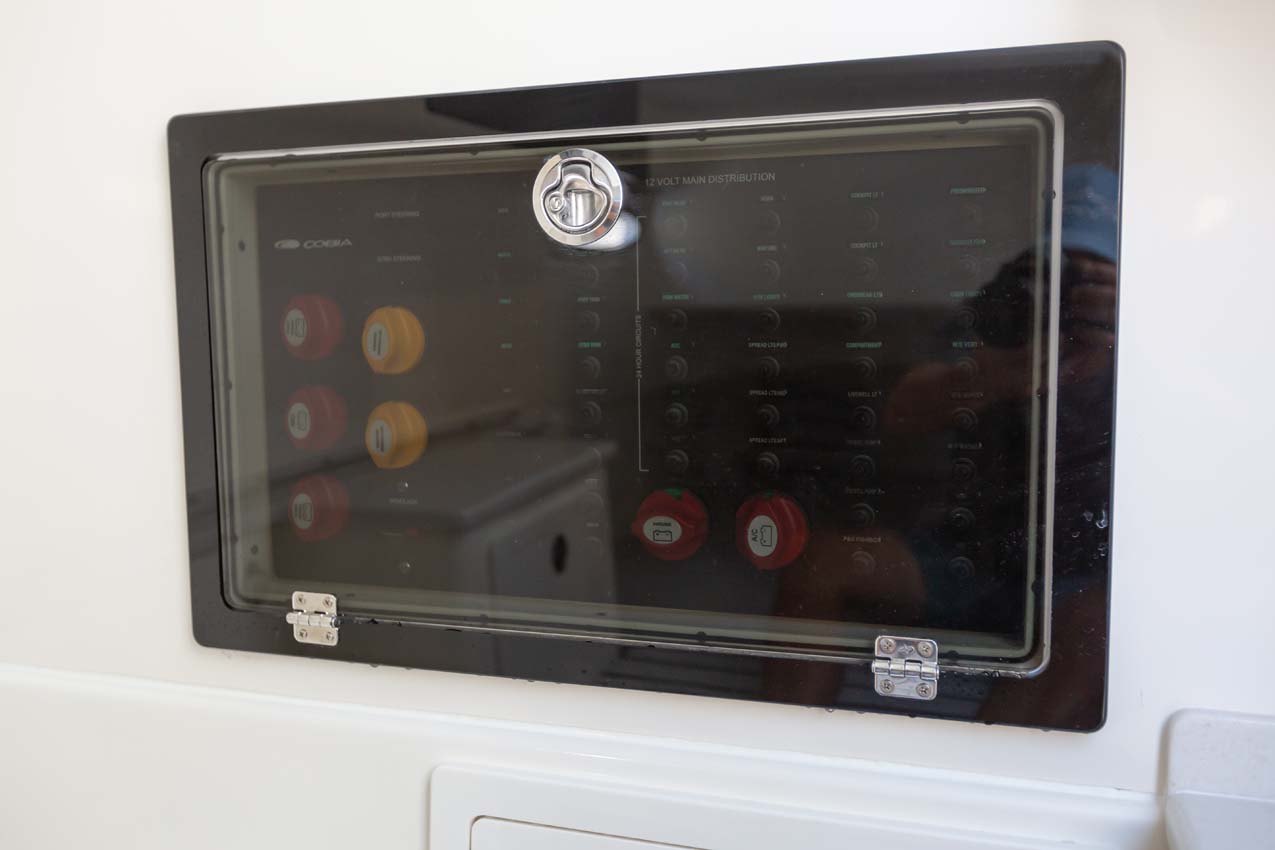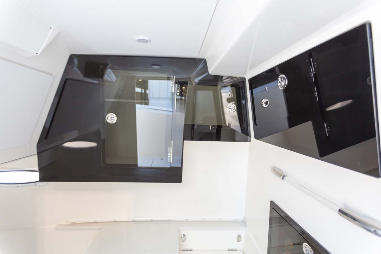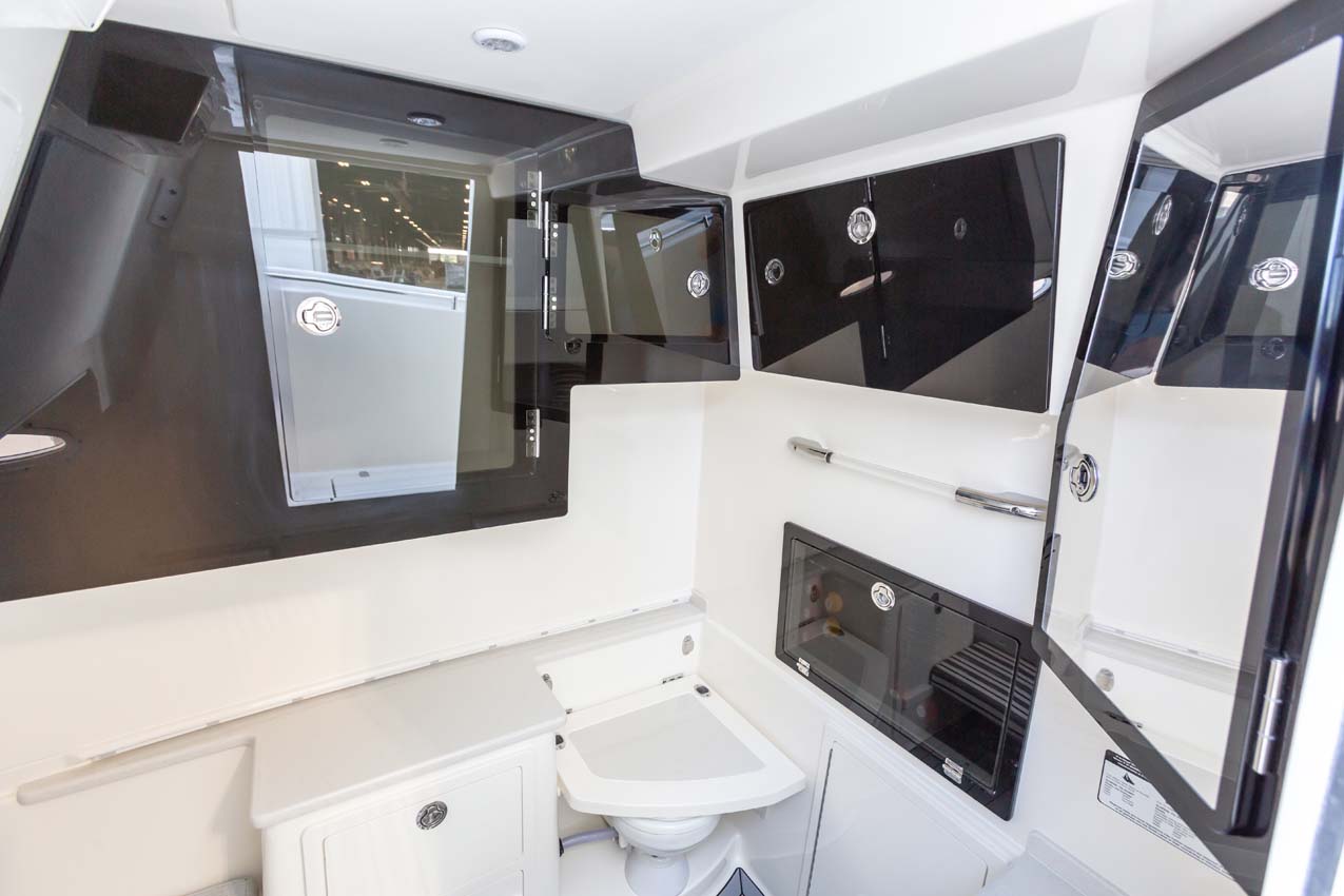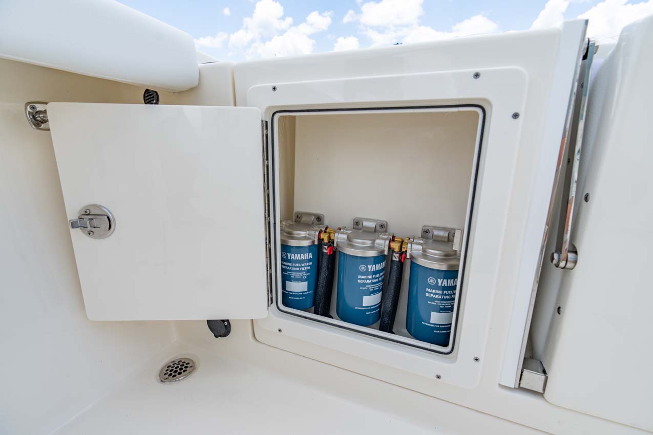 Tournament-capable fishing features include dual 42-gallon bait tanks, two huge in-floor fishboxes that pump overboard, a full tackle station and bait prep area, plus a hidden below-deck rod locker that’s lockable. With a wide-open cockpit, there’s plenty of room for a group of anglers and when it’s time to relax, it converts to a cruising and sandbar-hopping vessel with well-appointed seating for 11. That means triple independent helm seats, an integrated chaise lounge big enough for two and full sun lounge capability with forward-facing backrests. Plus, the inside of the console houses a spacious, airy berth that’s surrounded by a refined interior with wooden cabinetry, an electric head and a combination sink/shower.